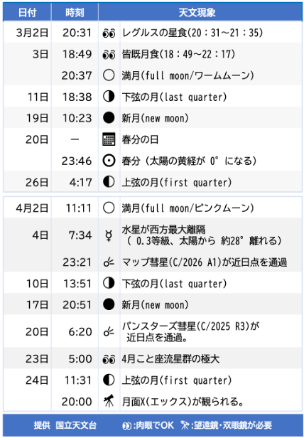 | 3月3日 皆既月食 | 月食スケジュール 18:49 部分食開始 20:04 皆既食開始(月が地球の影に完全に隠れる) 20:33 最大 21:03 皆既食終了 22:17 部分食の終了 |