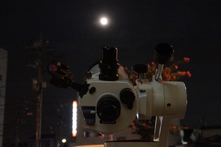 自宅を出るときに、月がもう見えている時刻なのにまだ低いせいか確認もできないまま、雷雲を見上げながら望遠鏡と傘(え!?)を車に積んで駅前に向かいました。