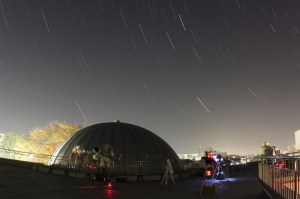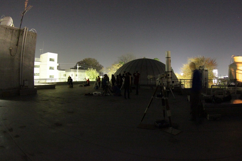 2階プラネタリウム室内で三浦先生による解説のあと、3階ドームの望遠鏡(ニコン15cm屈折望遠鏡)で観察、その後屋上に並べた「いちばんぼし」メンバーの望遠鏡を覗いていただきました。