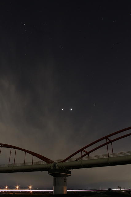 金星と木星の接近 3/13の撮影です。 (う!オリオン座のベテルギウスが入っていませんorz・・・雲があると集中力が・・・あ、いいわけですね^^;) 旧吹上町にある『荒川水管橋』で撮影しました。 この水管橋は、ナント!日本一長い水管橋なんですよ。 赤と白の可愛い色合いのこの橋は、秋のコスモスの時季には青空に映えてとても綺麗です。 この日は水管橋の上に金星(右の明るい星)と木星(左の星)が並びました。 これからは金星がどんどん上に上がっていきます。 共有: クリックして X で共有 (新しいウィンドウで開きます) X Facebook で共有するにはクリックしてください (新しいウィンドウで開きます) Facebook いいね 読み込み中… 関連