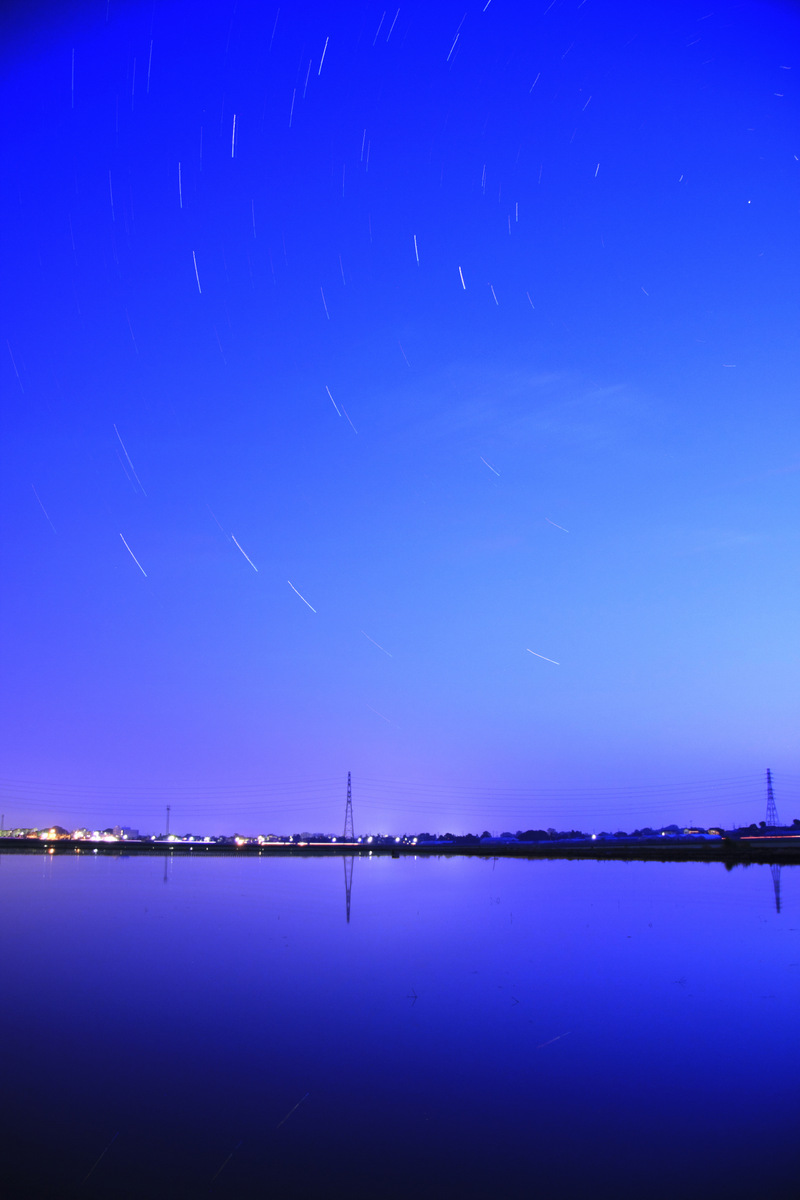 青のカラーチャートのようですね。一度水面に映る星跡を撮ってみたいです。