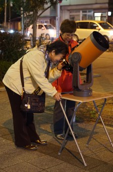 月齢11の月は機材によって眩しいくらいに見えていましたし、はくちょう座の二重星「アルビレオ」や昇ったばかりのおうし座の「すばる(プレヤデス星団)」なども見ていただきました。外国からのお客様も多く足を止めていただき、カンボジアから来た皆さんとは「竹取物語」のお話で盛り上がりましたが、はたして上手く伝わったでしょうか。