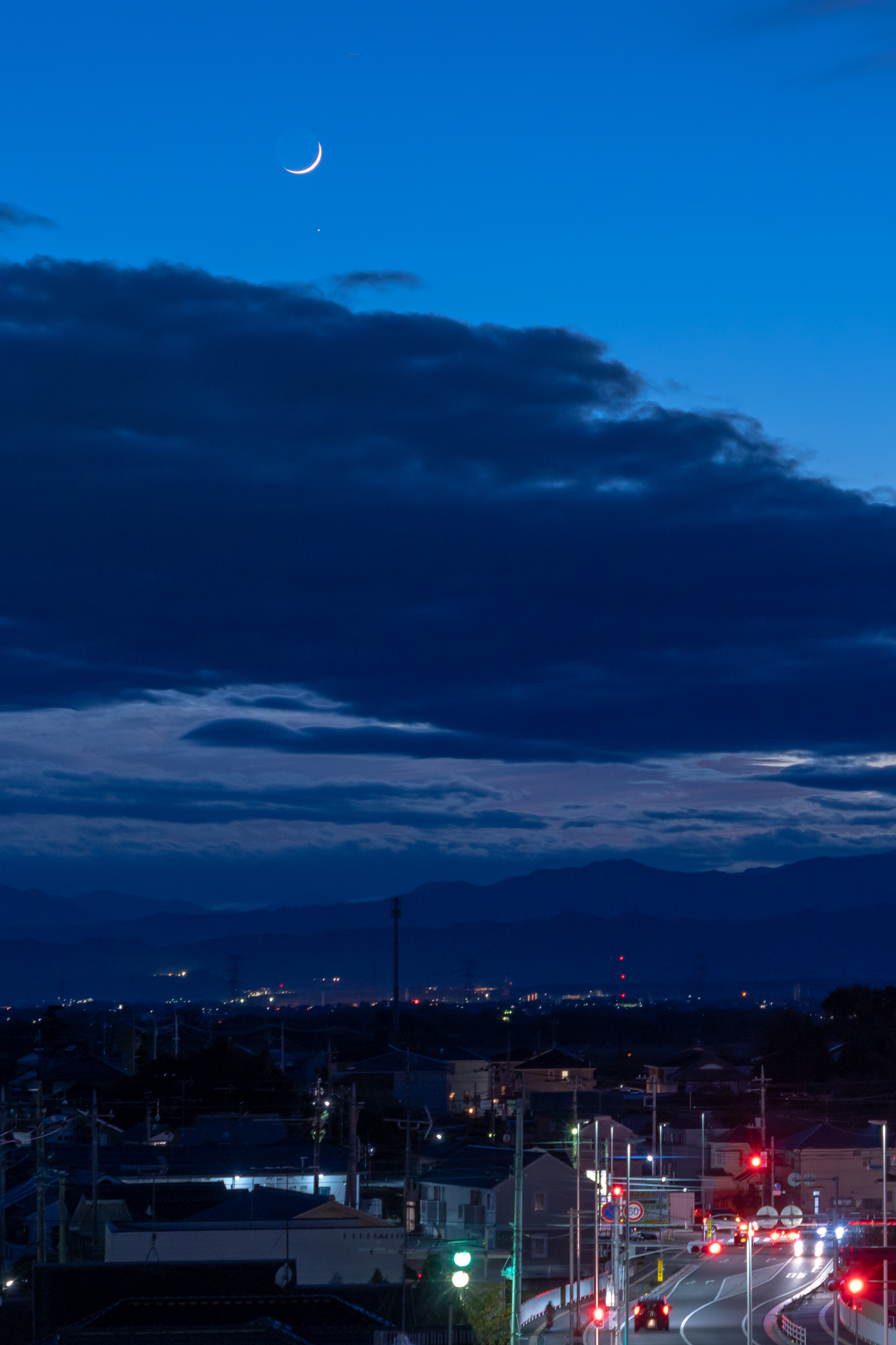 夕暮れ後、月齢2の月に土星が寄り添っていました。