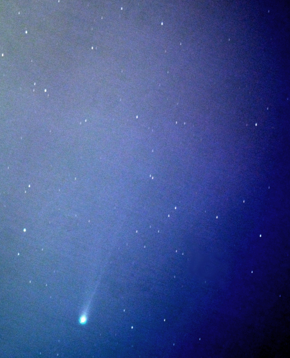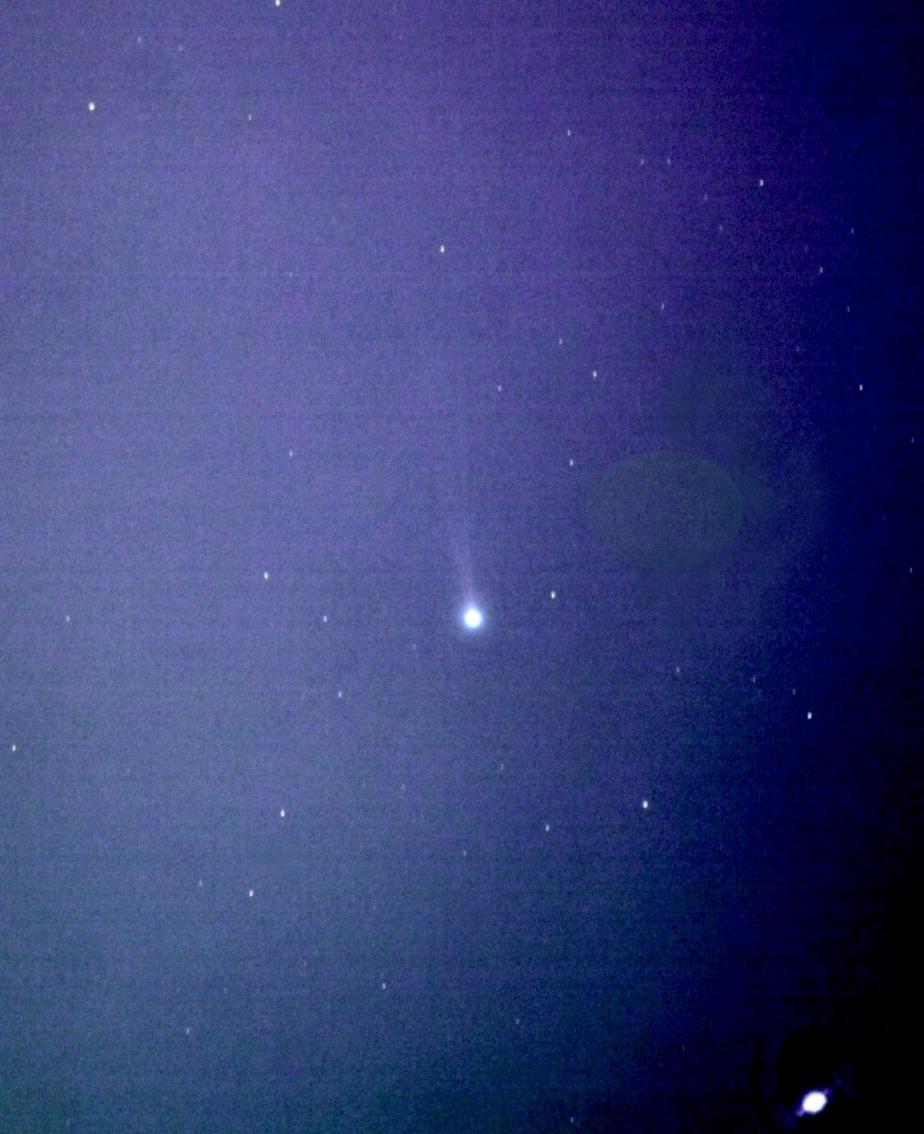 しかし、やはり街明りから逃れず、どうしても尾の淡い部分は、捉えられませんでしたが、細く真っ直ぐなイオンの尾と 若干カーブしているダストの尾(多分)が、重なっているのが見えます。