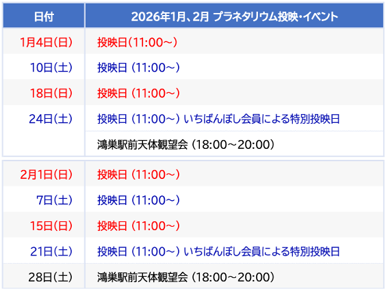 詳細は鴻巣児童センターにお問い合わせください。 - 天文台の中は外と同じ気温です。当日の気温変化に対しては服装で調節してください。